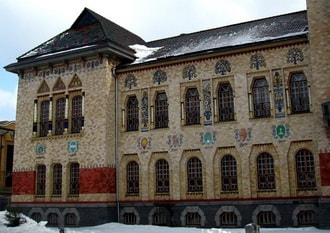 Фасади мають вишукану поліхромну декорацію з використанням традицій українського народного мистецтва: цоколь викладено з рожевого та сірого граніту, стіни облицьовано керамічною плиткою ясно-вохристої барви, на тлі якої виразно читаються поліхромні деталі — герби Полтави та повітових міст губернії, розетки, композиції на основі «вазона» та «дерева життя».