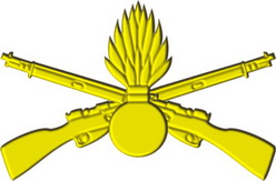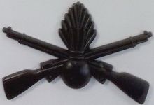 Емблема металева або пластмасова золотавого чи захисного кольору суцільноштампована у формі палаючої гренадки на тлі схрещених гвинтівок.