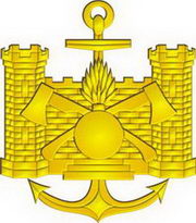 Емблема металева або пластмасова золотавого чи захисного кольору суцільноштампована у формі фортеці на тлі якоря, на яку накладено схрещені сокири та палаючу гренадку.