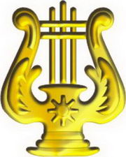 Емблема металева або пластмасова золотавого чи захисного кольору суцільноштампована у формі стилізованої ліри.