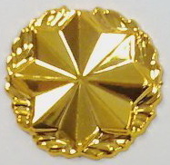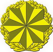 Емблема металева або пластмасова золотавого чи захисного кольору суцільноштампована у формі восьмикутної зірки з розбіжними двогранними променями, накладеної на вінок із дубового листя.