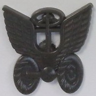 Емблема металева або пластмасова золотавого чи захисного кольору суцільноштампована у формі вісі з автомобільними колесами, крилами та кермом.