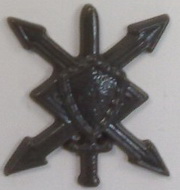 Емблема металева або пластмасова золотавого чи захисного кольору суцільноштампована у формі меча вістрям угору, обабіч якого подвійні стріли. У центрі розміщено стилізований щит.