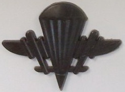 Емблема металева або пластмасова золотавого чи захисного кольору суцільноштампована у формі розкритого парашута на тлі двох літаків.