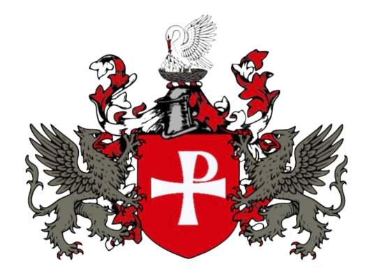 Щитотримачі: два золоті грифони, з червоними кігтями, дзьобами та язиками. Під щитом на срібній стрічці із червоним підкладом девіз: Acta, non verba."