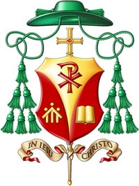Щит увінчаний геральдичним зеленим єпископським капелюхом зі шнурками та дванадцятьма зеленими китицями.