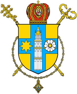 Щит увінчано золотою єпископською митрою з червоним підбиттям і накладено на золотий архиєпископський жезл, процесійний хрест і панагію, які вказують, що це герб церковно-територіальної одиниці – єпархії Православної церкви України.