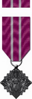 Стрічка медалі шовкова муарова з поздовжніми смужками (зліва направо): малинового кольору - 11 мм, сірого кольору - 3 мм, малинового кольору - 7 мм, сірого кольору - 3 мм, малинового кольору - 11 мм.