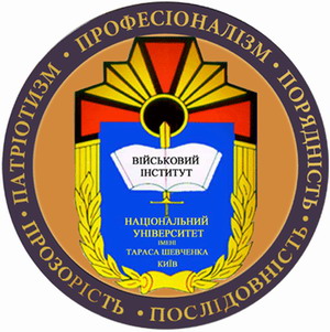 Нижче меча та книги білими літерами на синьому тлі відтворено надпис: «Київський національний університет імені Тараса Шевченка» -навчальний заклад, підрозділом якого є Військовий інститут. «м. Київ» - назва міста, в якому знаходиться навчальний заклад.