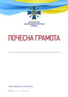 Під емблемою у чотири рядки по центру розміщено написи: "МІНІСТЕРСТВО ІНФОРМАЦІЙНОЇ ПОЛІТИКИ УКРАЇНИ", "ПОЧЕСНА ГРАМОТА".