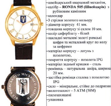 На задній кришці годинника міститься гравіювання "ВІД КИЇВСЬКОГО МІСЬКОГО ГОЛОВИ", ім'я та прізвище Київського міського голови, які утворюють форму кола, та підпис Київського міського голови у центрі цього кола.