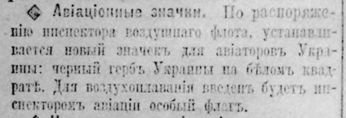 Однак можна стверджувати, що питання українських розпізнавальних знаків вивчено не повністю. Так, розповідаючи про авіацію Української Держави, Я.Тинченко наводить замітку з газети “Киевская Мысль” за 13 травня 1918 р. В ній повідомлялося, що за розпорядженням інспектора повітряного флоту встановлюється новий “значок” для авіаторів: чорний герб України на білому квадраті[7]. Дату і номер розпорядження, а також малюнок “значка”, замітка не містить.