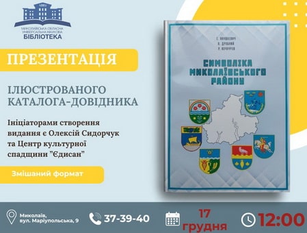17 грудня 2024 р. у Миколаївській обласній універсальній науковій бібліотеці відбулася презентація каталога-довідника «Символіка Миколаївського району» (Одеса: Видавничий дім «Гельветика», 2024). Видання було підготовлено авторським колективом у складі науковця, члена Українського геральдичного товариства, розробника близько 200 гербів і прапорів Ігоря Янушкевича; науковця, голови ГО "СВІТОВИД" - об'єднання краєзнавців Миколаївського району, члена Українського геральдичного товариства, співавтора 14 гербів сіл Миколаївського району Віктора Дробного; науковця, члена Українського геральдичного товариства, автора гербів населених пунктів в Миколаївській та Запорізькій областях Романа Кочкурова. Ініціаторами створення видання виступили «Центр культурної спадщини ЄДИСАН» та краєзнавець-дослідник Олексій Сидорчук.