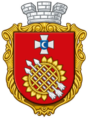 У червоному полі золоте сито, пробите знизу у перев'яз вправо трьома срібними стрілами, середня з яких довша від інших, з вільних країв сито обрамоване золотими пелюстками соняшника; вгорі - срібний лапчастий укорочений хрест, на якому синій щиток із срібним півмісяцем, ріжками вліво.