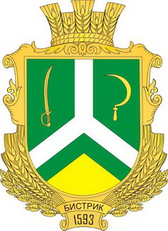 Затверджений рішенням 22-ї сесії 5-го скликання від 22.05. 2009 р. На зеленому полі срібний перекинутий вилоподібний хрест. У першій частині золота шабля у стовп вістрям до гори, у другій - золотий серп у стовп вістрям до гори, у третій – золоте понижене вістря. Щит розміщений у золотому картуші, верхня половина якого еклектична, а нижня утворена з колосків, унизу якого на золотій стрічці чорними літерами - „Бистрик”, під стрічкою чорні цифри 1593.