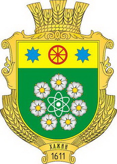 На зеленому полі срібний символ атома, який супроводжується навколо сімома срібними трояндами з золотими серединками і чашолистиками. На золотій главі щита червоне колесо, обабіч якого по одній лазуровій восьмипроменевій зірці. Щит розміщений на золотому картуші, верхня половина якого еклектична, а нижня утворена з колосків, унизу якого на золотій стрічці чорними літерами - "Хажин", під стрічкою чорними цифрами - "1611". Щит увінчаний золотою сiльською короною.