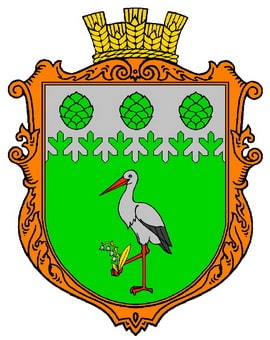 Герб: у зеленому полі стоїть срібний лелека з чорним оперенням і червоним дзьобом та лапами, у правій лапі він тримає конвалію із золотим стеблом і листками та срібними квітами, у відтятій ялинопагоноподібно срібній главі – три зелені шишки хмелю в один ряд.