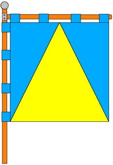 Прапор: квадратне полотнище, з нижніх кутів до середини верхнього краю йде жовтий клин, обабіч – сині поля.