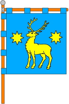 Прапор: квадратне синє полотнище, на якому стоїть жовтий олень, обабіч нього – по жовтій 8-променевій зірці.