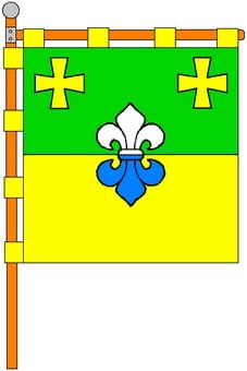 Прапор: квадратне полотнище, яке складається з двох рівновеликих горизонтальних смуг – зеленої й жовтої, у центрі – подвійна біло-синя лілія, над нею у верхніх кутах – по жовтому козацькому хресту.