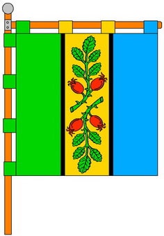 Прапор: квадратне полотнище, яке складається з п’яти вертикальних смуг, від древка – зеленої, чорної, жовтої, чорної та синьої (співвідношення їхніх ширин рівне 10:1:10:1:10), посередині жовтої смуги дві зелені гілочки шипшини з листочками та з двома червоними плодами кожна.