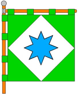 Прапор: квадратне зелене полотнище, на ньому біле квадратне поле, кути якого знаходяться посередині сторін прапора, в його центрі – синя 8-променева зірка (розмах променів зірки рівний половині сторони прапора).
