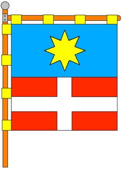Прапор: квадратне полотнище, що складається з двох рівновеликих горизонтальних смуг – верхньої синьої, на якій жовта 8-променева зірка (розмах променів становить 2/5 сторони прапора), та нижньої червоної, на якій білий прямий хрест (ширина рамен хреста становить 1/7 сторони прапора).