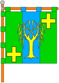 Прапор: квадратне полотнище, яке складається з трьох рівновеликих вертикальних смуг – зеленої, синьої та зеленої, у центрі стоїть жовте росохате дерево без листя, вгорі якого у верхньому куті з вільного краю та в нижньому від древка – по жовтому прямому хресту.