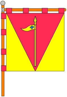 Прапор: квадратне полотнище; з верхніх кутів до середини нижнього краю відходить малиновий клин, на ньому жовтий спис вістрям угору із жовтим прапорцем, на якому синій козацький хрест, обабіч клина – по жовтому трикутному полю.
