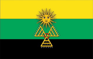 Прапор: прямокутне полотнище з трьома рівновеликими горизонтальними смугами жовтого, зеленого, чорного кольорів. На полотнищі розміщено в центрі золоте усміхнене сонце над потрійною жовтою бороною, скованою червоним кільцем.