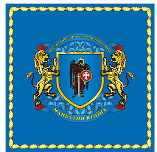 Прапор: квадратне синє полотнище, посередині якого герб; по периметру прапора йдуть золотисті листочки.