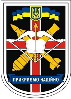 Щит нарукавної емблеми дивізіону — чорного кольору. Посередині щита зображено розкриту книгу срібного (білого) кольору на тлі натягнутого лука срібного (білого) кольору зі стрілою золотого (жовтого) кольору та схрещених ракети і гарматного ствола золотого (жовтого) кольору. Лук зі стрілою, гарматний ствол і ракета свідчать про приналежність дивізіону до зенітних ракетних військ та його основне завдання — підготовку молодших фахівців для цього роду військ. Розкрита книга символізує навчання. На стрічці у нижній частині щита девіз частини: «ПРИКРИЄМО НАДІЙНО».