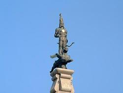 Внушительная по величине (около 5 метров) бронзовая скульптура тем не менее кажется маленькой на вершине величественной стелы. Но увеличение ее размеров, как предлагали некоторые скульпторы, нарушило бы очень точные пропорции скульптуры и стелы, не говоря уже о ее эстетике как архитектурного сооружения. И сейчас трудно представить столб без скульптуры: статуя Золотого принца на барсе является его навершием и составной частью.