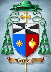 Щит увінчаний геральдичним зеленим єпископським капелюхом зі шнурками та дванадцятьма зеленими китицями.