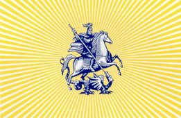Центр кола - білого кольору з сонячними променями, що розходяться радіально від центру. На цьому тлі зображена фігура Св. Георгія (Юрія) Переможця на коні синього кольору, розвернутого у праву сторону від спостерігача.