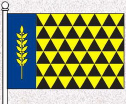 Поділений трикутниковидно чорною барвою та золотом щит з широкою розтятою на зелене та червоне облямівкою.