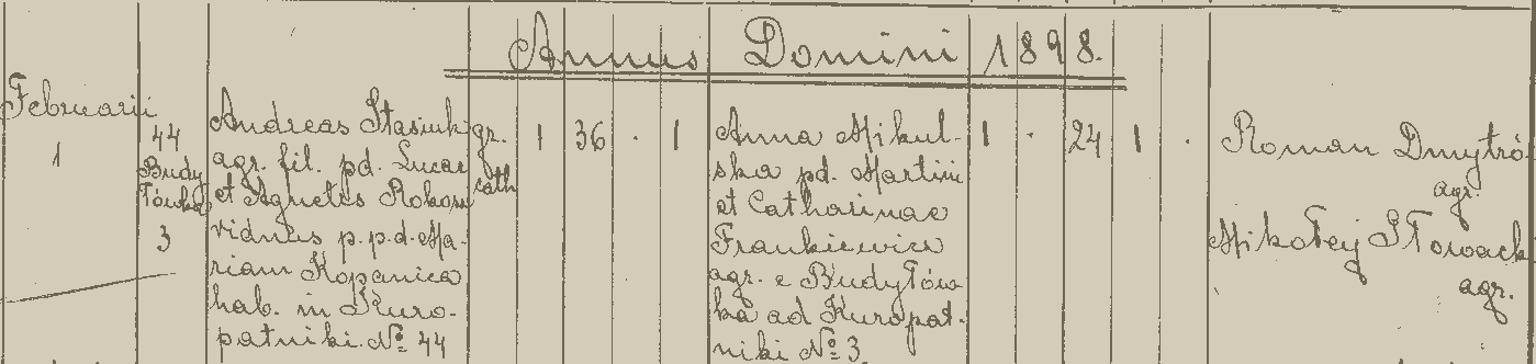 мій прапрадід,Андрій ,являється сином Луки Стасюка та Агнеси Рокош.має місце запис про народження Андрія у домі №44. та про його шлюб у домі №44.
