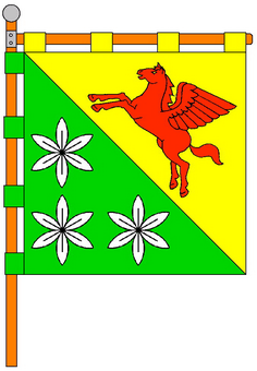 Прапор: квадратне полотнище, розділене з верхнього кута від древка по діагоналі на два рівновеликі трикутні поля, на верхньому жовтому біжить червоний крилатий кінь, на нижньому зеленому – три білі квітки черемші.