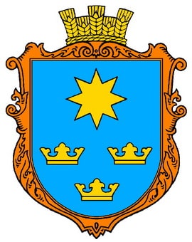 Герб: у синьому полі золота 8-променева зірка, під нею три такі ж корони, дві над одною.