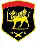 Герб: У чорному полі з вузькою червоною главою стоїть на трьох лапах золотий Симаргл з вовчою головою та крилами і тримає в піднятій передній правій лапі золоту козачу шаблю з червоним руків’ям, а лівою передньою таку ж шаблю притискає додолу; під ним – покладені навхрест і спрямовані вгору дві золоті гармати, обабіч яких два такі ж сиглі – «М» і «Б».